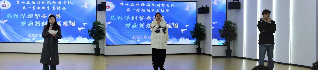 队长王银瀛代表督查队作学期工作总结报告。她系统汇报了本学期督查队在校园文明督查、课堂考勤、早锻炼与晚自习检查及相关文明主题活动组织等方面取得的成果,深入剖析了工作中存在的问题与不足,并提出具体整改措施。他还围绕队伍建设与效能提升,对新学期工作方向进行了初步部署。